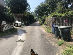 I decided to take a promenade through one of these here Forest-Hills alleys. It was so quiet! And green (even besides the trash cans). A Crepe Myrtle was in full bloom; A monarch butterfly disturbed the air.