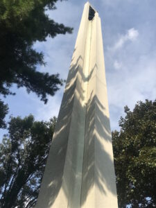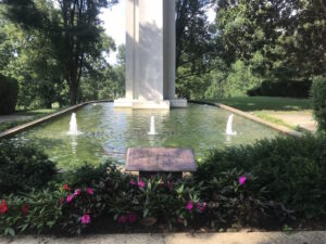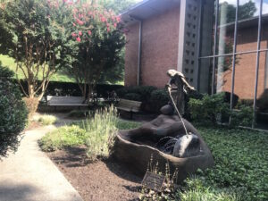 Well, it wasn’t like that (what is it they say about “expectations being disappointments waiting to happen”?). The buildings were all modern brick, long and low, in the 1950s and 1960s style—not totally unlike my high school. But the campus did have a nice grove of shady trees that was a refuge for my aching eyes, a fountain statue of Moses striking the rock in the desert, and a large white bell-tower with a beautiful fountain pool, which were better than anything I could have imagined. There was also a statue of John Wesley, but it was down a steep grassy lawn, with no sidewalk or stairs, so I decided to admire him from a distance.