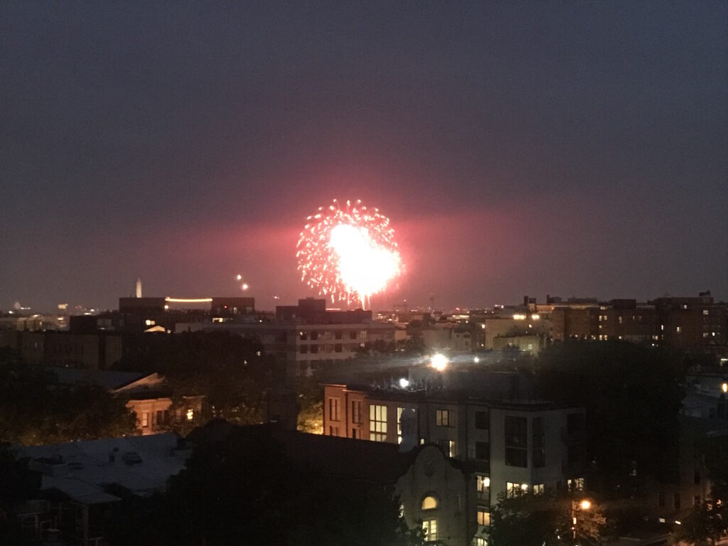 (the Washington Monument, the Capitol, the Cathedral) and church spires set off against the darkening sky. To add to the drama, fireworks exploded in 360 degrees around us.