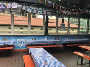 But to make up for that, it was festively done up: Flags festooned the ceilings, while walls (and tablecloths) sported the blue and white Oktoberfest diamond pattern. In lieu of a garden, a large wall of windows offered views of the neighboring rooftops and sky.