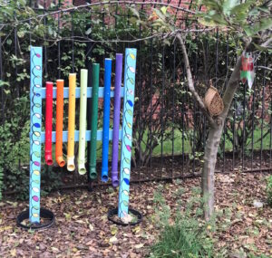 Anyone but Lola, that is. But the woman offered to hold her while I explored this lovely secret garden, with its painted walkway stones, a purple utensil shed, and a giant xylophone-ish rainbow sculpture. Zinnia, herbs, tomatoes, and even a small strawberry garden, among other things, grew in the various corners of the lot. It was an utterly charming experience to be in this space that people obviously loved and cultivated in the middle of the city, in the middle of a crappy overwhelming day, in the middle of my bad-mood funk. I can only imagine the transformative magic that it held for children.