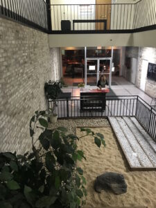 But inside, a charming zen garden overlooked on three sides by a balcony greets you. A guy with a Square machine at a makeshift counter constitutes the box office; a half sheet of photocopied office paper suffices for the ticket, and, upstairs, another little counter with a few tables and chairs fills the role of snack bar. The whole place is warm and welcoming.